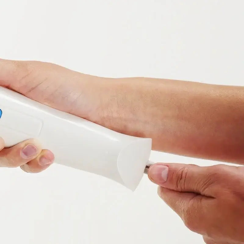 Der weiche Silikonkopf fühlt sich angenehm an und ist leicht zu reinigen. Dank des Akkus können wir es überall verwenden – fantastisch.